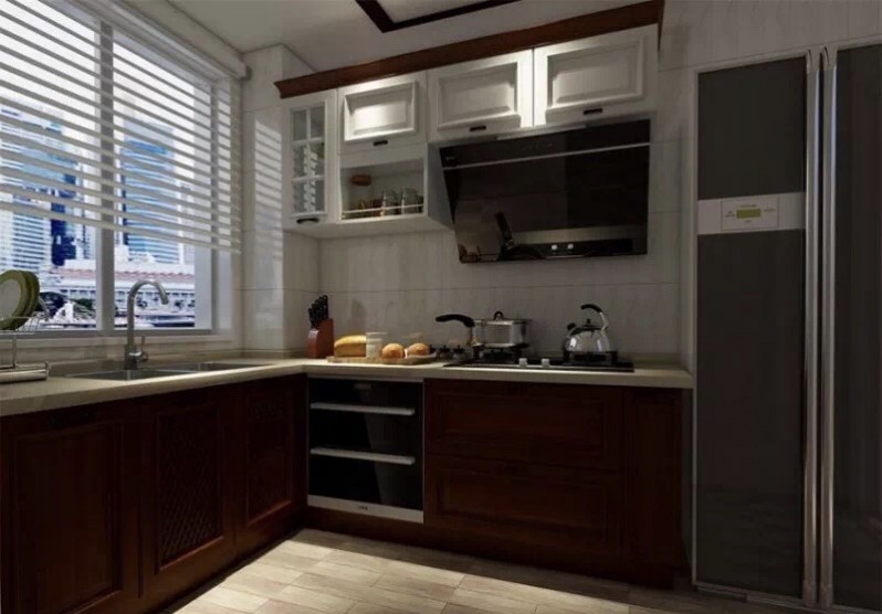 吊柜風格與客廳一脈相承,開放柜與封閉柜相結合,設計精致又實用,再加上深棕色地柜的搭配,讓全家最具煙火氣的地方,也優雅別致。