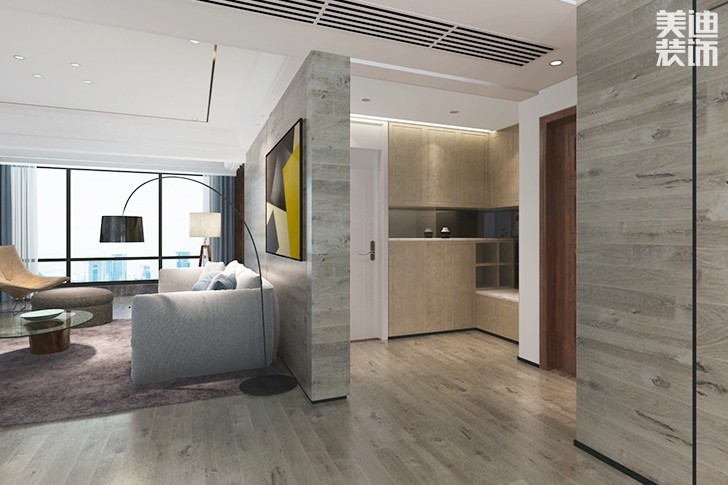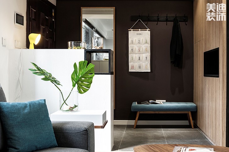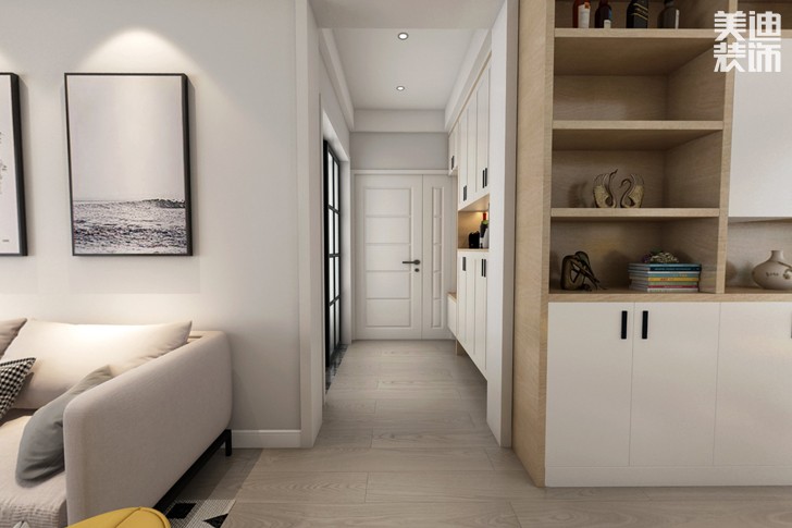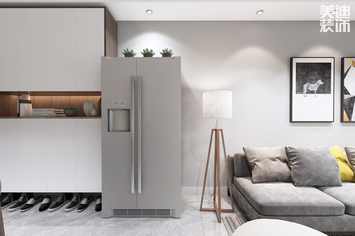 玄關進門處是鞋柜門,隱藏在其中的是旋轉鞋架,總共可以放70多雙鞋。這樣隱形的設計因其不占用空間,外表看起來簡單大方,實則暗藏玄機,容納性很強的特點,最近幾年在家居市場十分火爆。
